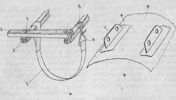 Рис. 2. Способы крепления баллонов к платформе: а – с помощью ленты; б – с помощью накладок с люверсами; 1 – лента; 2 – продольный брус платформы; 3 – поперечная балка; 4 – болт с шайбами и барашком; 5 – шнур; 6 – скоба из стальной проволоки; 7 – люверсы; 8 – накладка из прорезиненной ткани; 9 – поверхность баллона