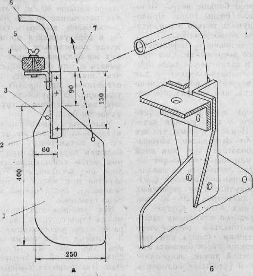 Рис. 4. Руль: а – детали руля; б – общий вид; 1 – перо руля; 2 – винт с гайкой (ось вращения при подъеме руля); 3 – винт-ограничитель обратного движения при опускании руля; 4 – поперечная балка (кормовая); 5 – болт с шайбами и барашком; 6 – румпель; 7 – сорлинь (тросик для подъема пера руля)
