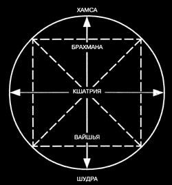 С другой стороны, г. Миз, оправдываясь, впрочем, в слишком далеко зашедшей аналогии, старается указать соответствие четырех варн с четырьмя ашрамами или правильными стадиями существования, на чем здесь мы останавливаться не будем, а также с четырьмя целями человеческой жизни, о которых мы уже говорили в связи с дхармой.; но в этом последнем случае сам факт, что речь всегда идет о четверичном делении, приводит его к явной неточности. Очевидно, что неприемлемо на деле предлагать в качестве цели, пусть даже существу самому низкому из всех, достижение чего-то, что соответствовало бы просто-напросто тамасу; распределение, если хотят его осуществить с низу до верху, на самом деле должно, таким образом, начинаться со степени, которая располагается непосредственно над ним, как это показывает наша вторая схема; легко понять, что дхарма как раз соответствует саттве, кама — раджасу, и артха — смеси раджаса и тамаса.