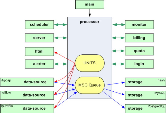 processor хранит в себе полные сведения обо всех объектах, подлежащих учету (IP–адреса, подсети), политиках учета, организует передачу сообщений между другими сервисами