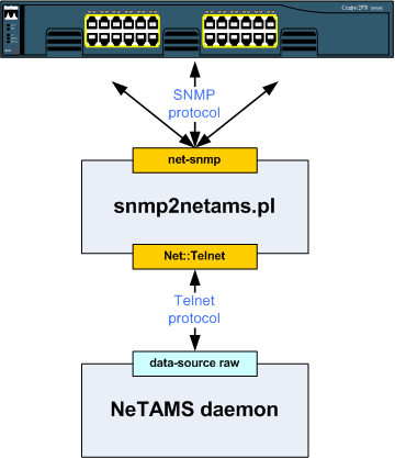 Информация о прошедшем трафике может поставляться сервису data–source от операционной системы или от внешнего устройства/приложения. Операционная система может предоставлять механизм перехвата (divert, ipq) и/или копирования (tee, ulog) проходящих через ядро пакетов userland–приложению, каковым является NeTAMS, или отслеживать пакеты, проходящие «мимо» или «через» сетевой интерфейс при помощи библиотеки libpcap. С другой стороны, исходная информация о прошедшем трафике может быть сгенерирована в виде потока сообщений протокола Cisco NetFlow установленным в сети маршрутизатором Cisco или одной из множества свободно доступных программ, снимающих статистику и генерирующих потоки NetFlow. Среди них fprobe (http://www.fprobe.org), ng_netflow (только FreeBSD, /usr/ports/net/ng_netflow), ipfw2netflow и flowprobe (входят в комплект поставки NeTAMS).