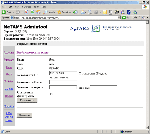 Поскольку первичным источником информации о трафике является IP–пакет, то основным объектом, статистика по которому учитывается, является IP–адрес. Совместно с адресом хранятся правила (политики) учета и фильтрации, ключ БД и другая информация, совместно образуя единую учетную единицу, или юнит (NetUnit). В настоящий момент поддерживаются следующие типы юнитов: