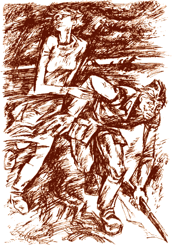 Мы уже устали бежать, дышать нечем, перешли на торопливый шаг. Цепь наша сильно перекосилась, крыло, которое дальше от леса, отстает. Как воду в низинку, всех сносит к лесу, где и рытвин не столько, и круг поменьше.