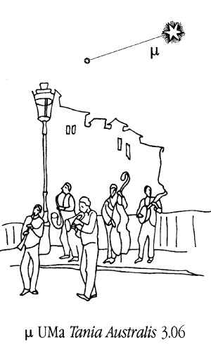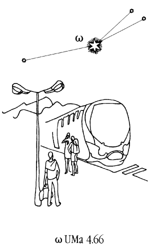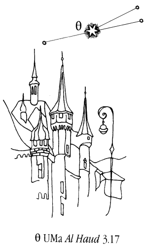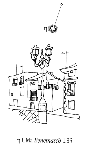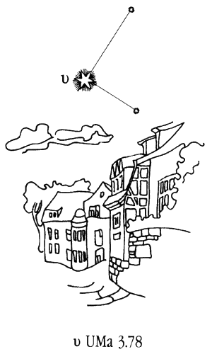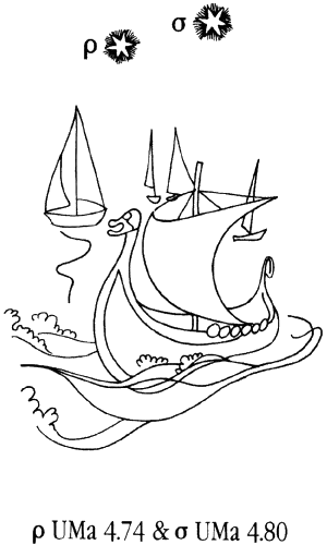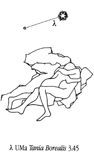И напоследок небольшая справка. Большая Медведица, третье по размерам созвездие неба, покрывает значительный участок зоны околополюсных созвездий Северного полушария. Рисунок, образуемый группой из семи наиболее ярких звезд, составляющих крестец и хвост Медведицы и известных как Плуг, или Большой ковш, легко узнаваем и поэтому служит прекрасным отправным пунктом для ориентировки на небе.