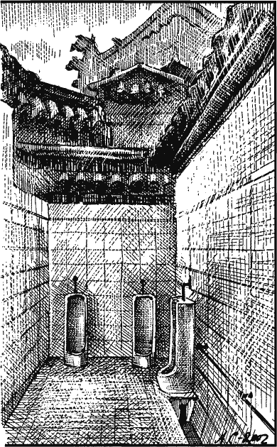 (обратно)Велико разнообразие сельских туалетов! Археолог В. Алкин в устной беседе сообщил автору этих строк о лабиринтообразном туалете, который он наблюдал в одном из северных районов Китая. Этот туалет представлял собой каменную стену немногим выше пояса, заставлявшую жаждущего пройти вдоль ее спиральных изгибов некоторое расстояние, пока он наконец не оказывался в середине лабиринта, в месте, отведенном для удовлетворения физиологических потребностей обоего типа.
