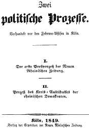 (обратно)Защитник Маркса и Энгельса адвокат Шнейдер II потребовал отложить судебное разбирательство ввиду того, что извещение о процессе не было своевременно (за десять дней) вручено обвиняемым.