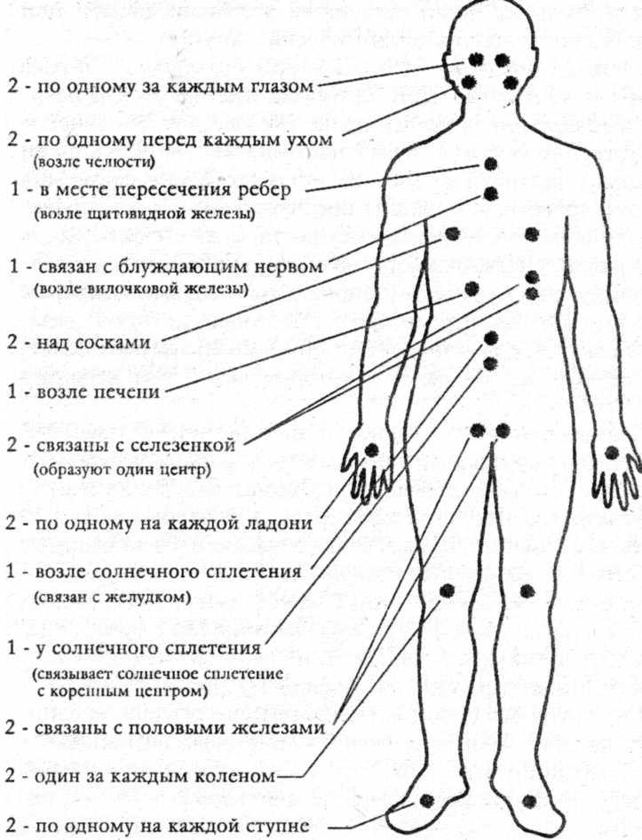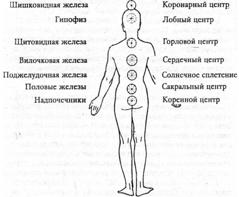 1. 7 первичных центров, где пересекается 21 энергетическая линия. (Их расположение, а также название эндокринных желез, с которыми они связаны, показано на рис. «Семь первичных центров».)