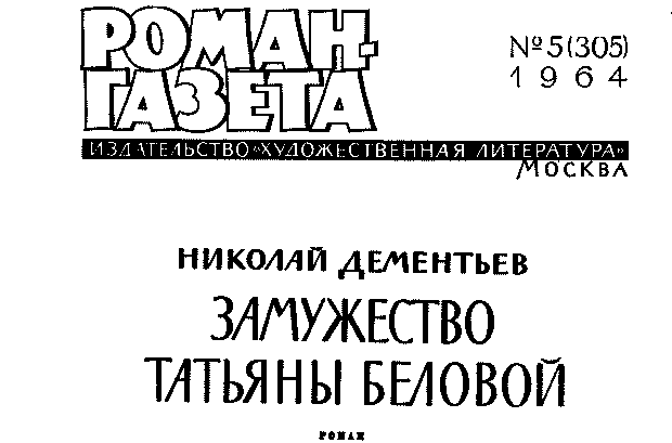 Новый роман Николая Дементьева „Замужество Татьяны Беловой" — это не просто важная веха в творчестве самого писателя. Он, несомненно, представлявляет одно из примечательных явлений нашей современной советской литературы, пример активного участия писателя в жизни народа, ведущего непримиримую борьбу за высокие моральные и душевные качества человека нового общества.