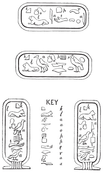 Чтобы дать нашим читателям наиболее полное представление об этом открытии, мы приведем здесь некоторые примеры египетских надписей, найденных в различных частях страны, которые переводятся как «Клеопатра», что было очень распространенным именем среди дочерей фараонов династии Птолемеев. Мы проставим рядом с каждой фигурой древней надписи современную букву, означающую похожий звук. Тогда сразу станет понятно, что они образуют с малым расхождением имя «Клеопатра».