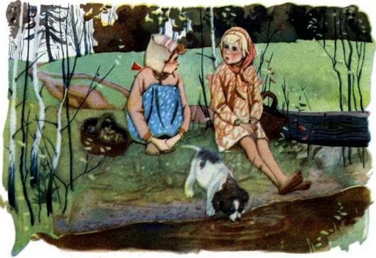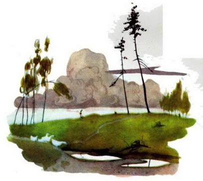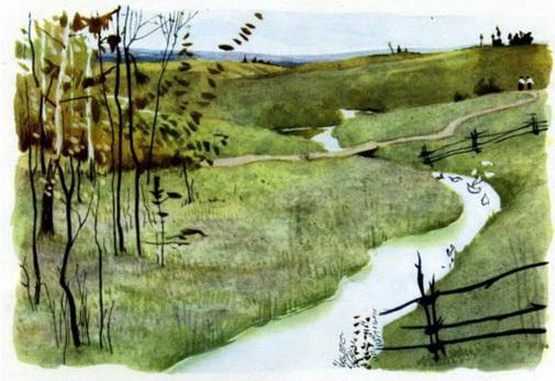Но ручеёк вдруг загордился. Он сказал себе: „Очень мне надо, чтобы берёзки в меня смотрелись, чтобы утки и гуси ныряли, чтобы ребятишки плескались в моей воде! Подумаешь, ещё бежать к ним! Кому нужно — сам придёт".