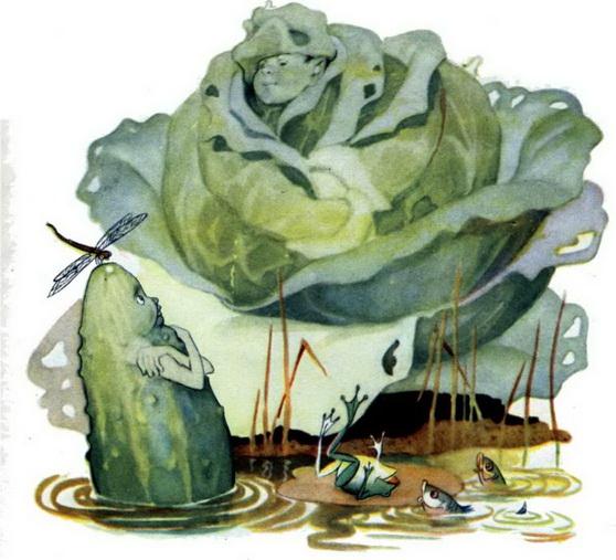 Однажды кочан капусты и огурец пошли вместе купаться на реку. Огурец сразу в воду бросился. А кочан капусты как стал на бережку раздеваться — раздевался до самого вечера. Огурец, дожидаясь его в воде, от холода весь покрылся пупырышками.
