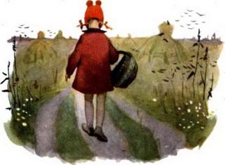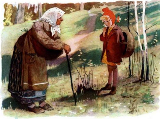 Ранним летним утром шла лесной тропинкой старушка. Ей повстречалась девочка со смешными, торчащими косичками и с насупленными бровями. Девочка несла пустую корзинку.