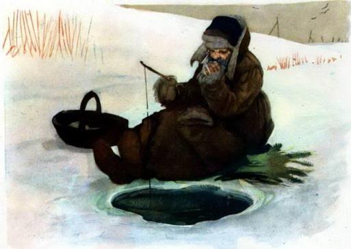 Одним духом доплыла плотица до второй проруби. Не успела отдышаться, как дедушка поймал её на удочку и вытянул вместе с синей курчавой ниткой.