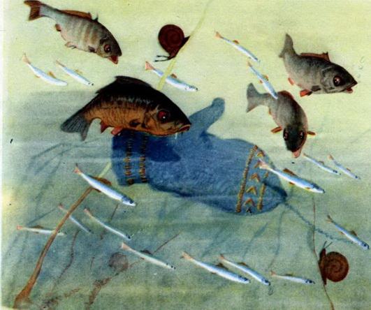 А плотичка у дедушки в корзинке всё бьёт и бьёт хвостиком — охота ей рассказать, как варежка рыбкой была.