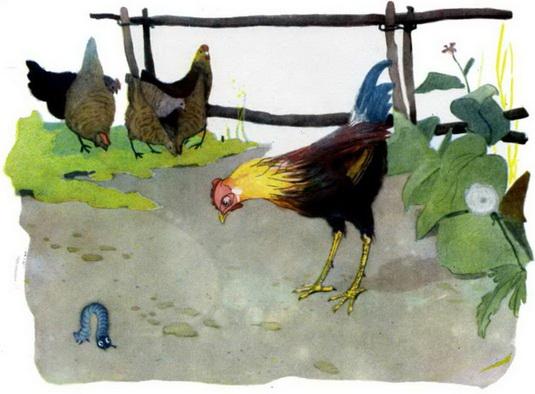 Вдруг он заметил на земле серую гусеницу. Она быстро—быстро перебирала своими коротенькими ножками. Цыплёнок внимательно посмотрел на неё и сказал: