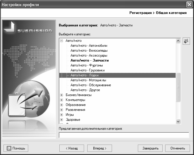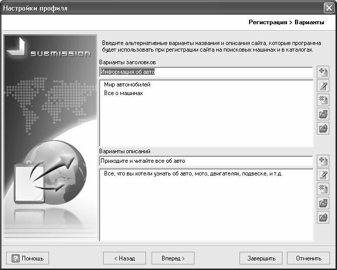 На момент написания данной книги в базе данных программы имеется более двух тысяч функционирующих ресурсов, отсортированных по региональной принадлежности. Благодаря этому у пользователя появляется возможность регистрации своего сайта в пошаговом режиме, корректируя описание и ключевые слова профиля в зависимости от того, в какой группе ресурсов он намерен регистрировать сайт.