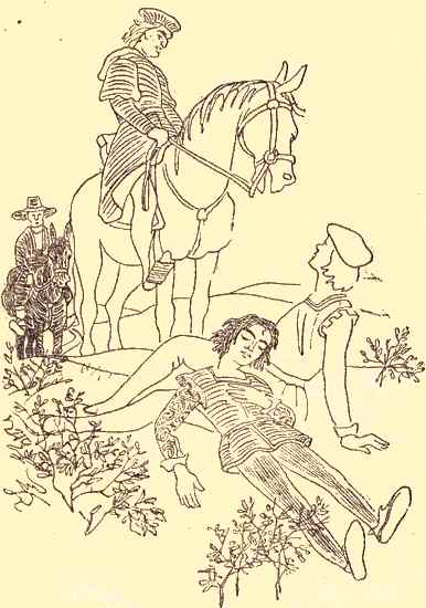Путники были бедно одеты, но их платье, хотя и сильно поношенное, было совсем иного происхождения, чем грубая одежда, которую носят жители деревень и городских предместий. На юношах были короткие камзолы, шерстяные чулки и береты на кудрях, падавших на уши. Чулки были залатанные и местами дырявые, камзолы вытерлись до основы, пыль также немало попортила все эти предметы; и все же можно было догадаться, что когда-то они были ярких цветов и стоили немалых денег.