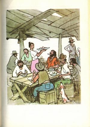 (обратно)Фамилия скваттера и название фермы даны со значением, юмористически обыграны: буквально — на ферме Дж.-У. Преуспевающего, станция Гребимонету. Это характерное для Лоусона средство комического.