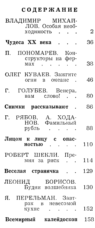 Установка, которую вы видите на этой обложке, не имеет никакого отношения ни к освоению космического пространства, ни к проникновению в таинственные недра земли. Это гигантская зерносушилка, спроектированная Украинским научно-исследовательским проектным институтом. Ее основная часть — турбореактивный двигатель. Мощный поток теплого воздуха, нагнетаемый двигателем, позволяет при помощи специальных приспособлений высушивать в сутки несколько вагонов кукурузного зерна.