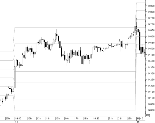 Измеряем торговый диапазон того времени, когда тенденция усилилась. Считаем, сколько баров подряд имели закрытие выше максимума предыдущего бара. Считаем, с какой цены это ускорение началось и на какой цене закончилось, – это и будет для нас Target-диапазон. Потом берем 62 и 100 % от этого диапазона и откладываем эти значения от нашего стопа в сторону открытой позиции. На этих уровнях и устанавливаем заявки для фиксации прибыли.