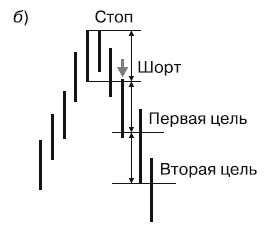 В этой модели разумнее использовать целевой уровень вместе с текущим стопом, устанавливаемым на минимуме или максимуме бара (рис. 103, а). Целевой уровень ставим на размер модели от уровня пробоя.