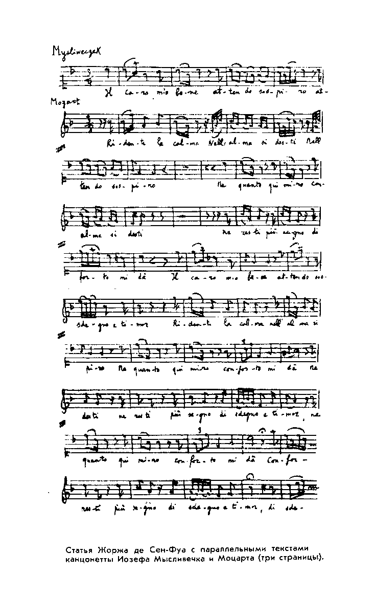 (обратно)Чарьз Бёрни. Дневник путешествия 1770 г. по Франции и Италии. Государственное музыкальное издательство. Л., 1961, с. 162. (К сожалению, в появившихся у нас, наконец, в русском переводе «Путешествиях» Бёрни много выпущено, в том числе и упоминания о Мысливичке.)
