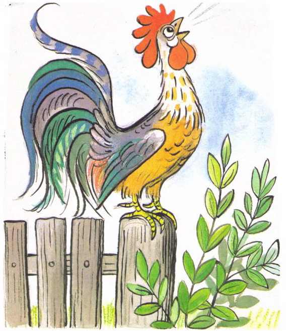 Однажды курочка задумалась, как бы ей вывести цыплят. А в это время петух в жёлтых штанишках взлетел на заоор, захлопал золотистыми крыльями и запел: