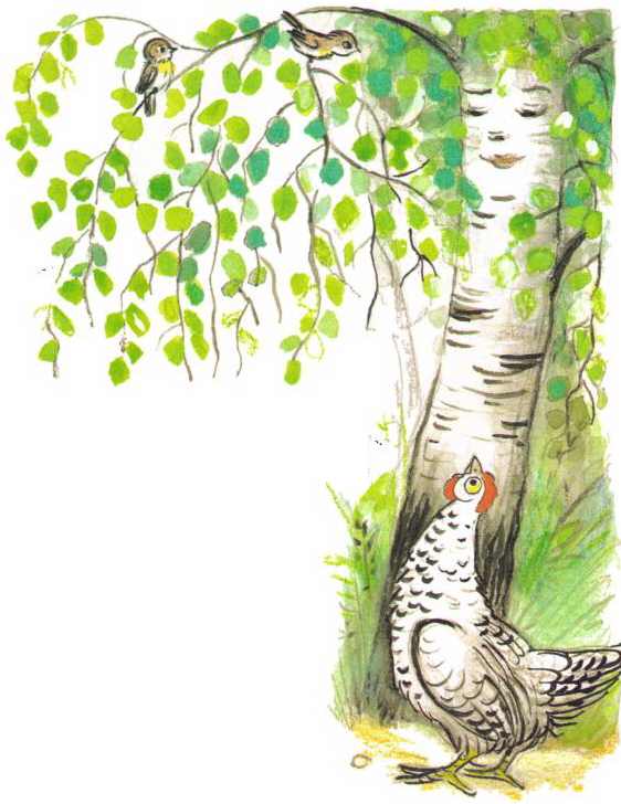 Она ко всему прислушивается. Курочка идёт и поёт, а старая берёза и говорит:
