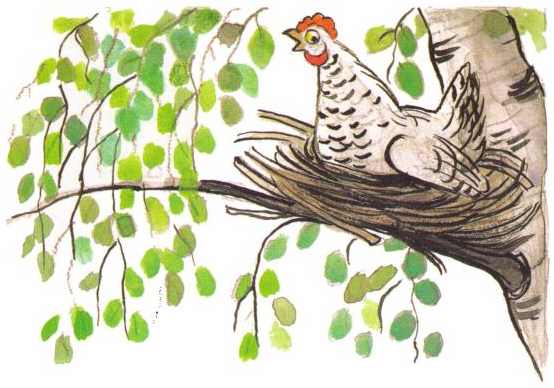 Курочка поблагодарила старую берёзу, осмотрелась, не подслушивает ли кто, и взлетела на дерево — в самую гущу листвы. Вот она кое-как примостилась в гнезде и снесла яичко. А потом от радости расхвасталась: