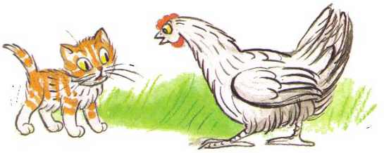 — Чего ты плачешь? — спрашивает его курица. Когда котёнок сказал ей, почему он плачет, курица стала его утешать.