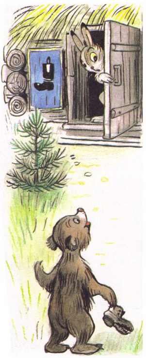 — Не может быть! — сказал медвежонок. — Вот уже три дня и три ночи, как я ищу дом с вывеской, где нарисован сапог. Там должен быть сапожник. Пусть он починит мой левый башмак. За это мама пришлёт вам горшок мёду.