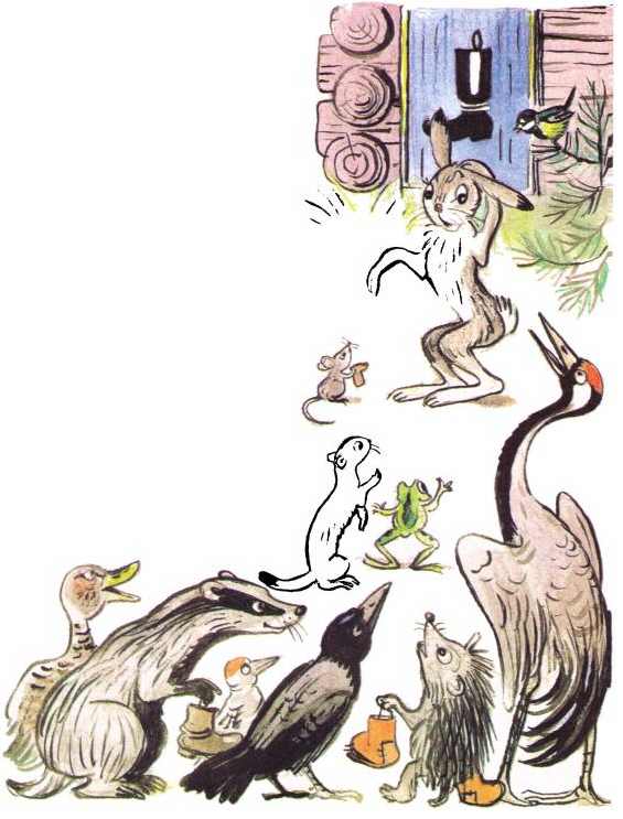Зайчиха хотела объяснить медвежонку, в чём дело, но в эту минуту около дома опустился длинноногий журавль: