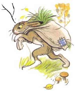 Теперь, когда приходит осень, у зайца много работы. Ему помогают и жена и дети. Дом их — полная чаша.