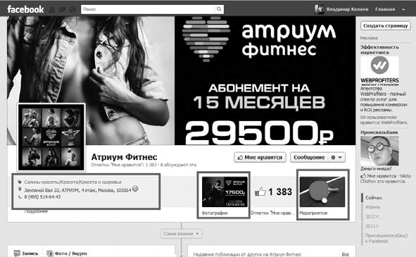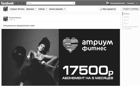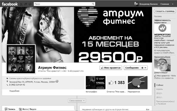 Рассмотрим несколько примеров удачных бизнес-страниц на Facebook. Первая из них – это страница фитнес-центра «Атриум». Самым важным для бизнес-страниц на Facebook является заголовок. На странице «Атриум» мы видим очень привлекательное женское тело, логотип фитнес-центра и рекламное предложение приобрести абонемент на 15 месяцев всего лишь за 22 500 рублей.