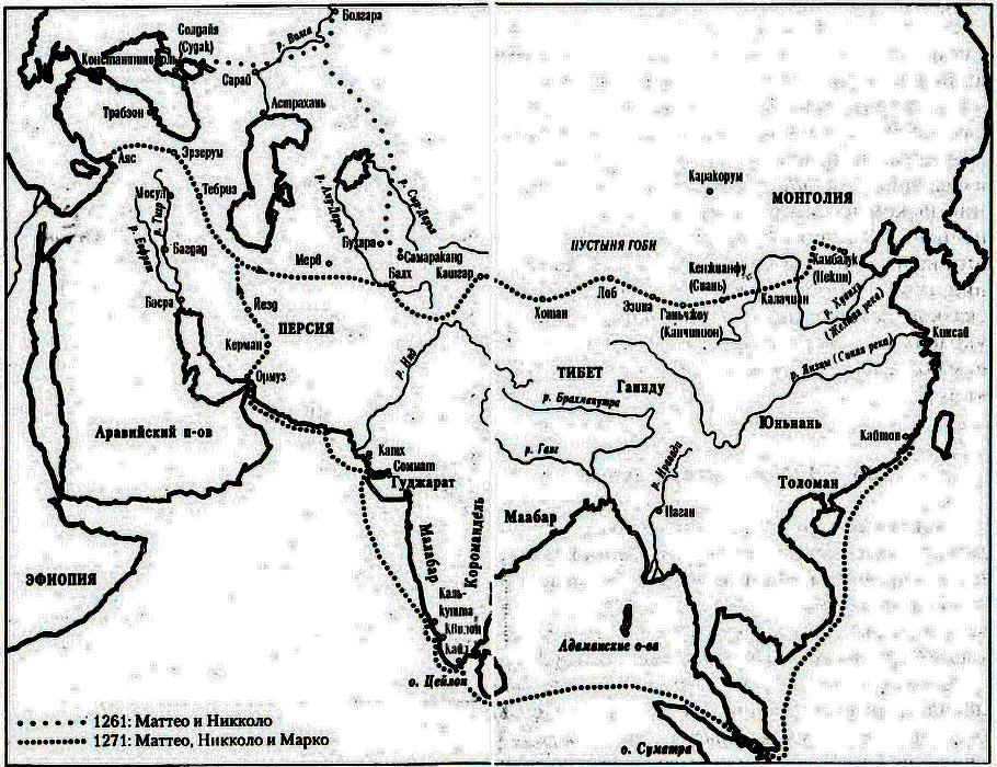Судьба семейства Поло во многом неясна. Что подвигло Марко на его великое путешествие, которое не принесло ему ни богатства, ни блестящего положения в обществе? Ответ на этот вопрос нам еще предстоит узнать. Марко Поло не был по достоинству оценен современниками, которые не признавали за ним никаких особых заслуг. Известно, что Поло не был первым путешественником, достигшим пределов Азии и владений монголов, которых христиане чаще называли татарами. Первой столицей китайской империи монголов был город Каракорум. Там уже побывали миссионеры, послы и торговцы из Европы, в частности, его отец Никколо и дядя Маттео (примерно за десять лет до Марко).