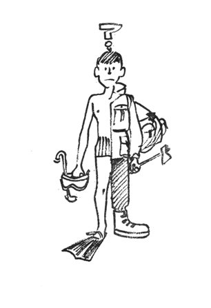 Мальчик вышел в коридор и тут увидел соседа в прорезиненной блузе, в шахтерском шлеме и с лампой.