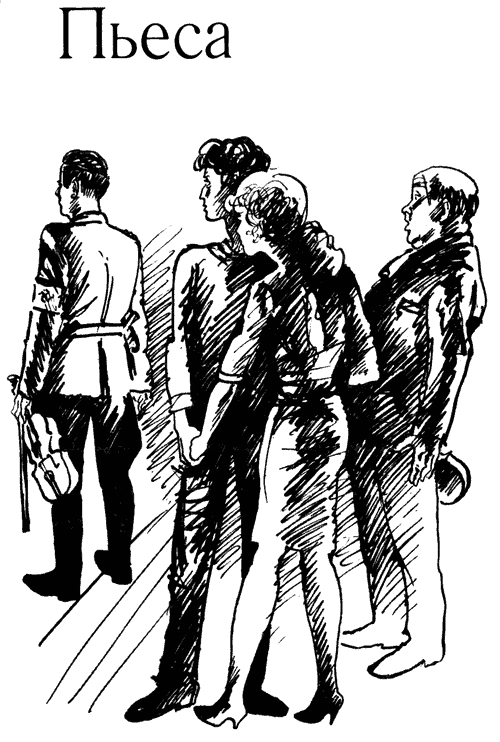 Кепке (указывая Фельдбергу на фрау Вейнберг, которая полулежит на диване, подняв вверх дрожащие руки). Вот! Еврейская свинья из соседней квартиры! (Указывая на остальных.) И этот, и те, и тот! (Указывая на Вендланда, что-то шепчет Фельдбергу.)