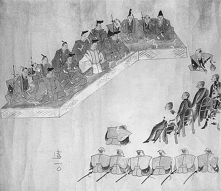Разумеется, деятельность сёгуната в Эдо была также обставлена определенными обрядами, но киотосские аристократы считали церемонии самураев «варварскими». Придворный Нономия Садамото, которому было приказано принять участие в поминальной службе по сёгуну Токугава Иэцуна в 1696 году, писал в своем дневнике, что военные не знают правильных манер, а потому и записывать, что происходило в Эдо, не имеет смысла. Поэтому в течение более чем одного месяца, которые он провел в окружении самураев, он не сделал в своем дневнике ни одной записи.