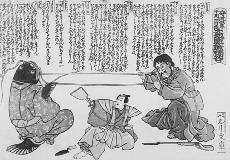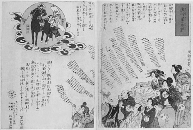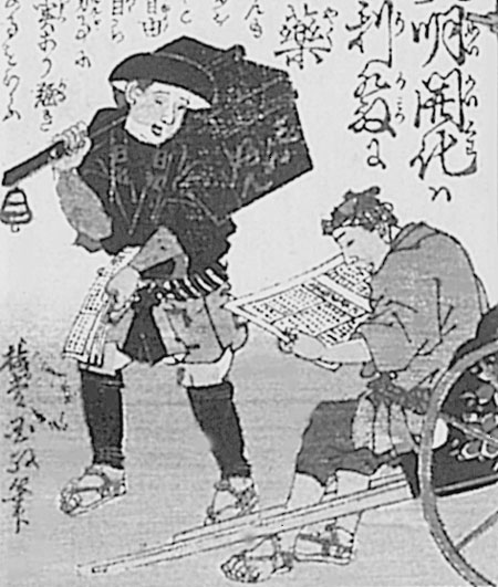 Грамотных в Японии того времени было немало: 45 процентов мужчин и 15 процентов женщин умели читать. Горожане быстро узнавали о произошедших катастрофах и крупнейших политических событиях. Этой цели служили экстренные выпуски цветных гравюр (нисики-э) и подобия газет – листовки, выпускавшиеся от случаю к случаю. Первые «листовки» появляются еще в начале XVII века. Качество печати было неважным – ведь для быстроты формы для печати изготавливались из глины, а не из дерева, как то было в случае с гравюрами (известный японцам с XVI века подвижной металлический шрифт сколько-нибудь широкого распространения не получил ввиду неприспособленности к иероглифической письменности). Именно поэтому эти листовки получили впоследствии название «черепичных» («каварабан»). Современники же обычно называли их «ёмиури» («продажное чтение вслух»), поскольку разносчики для привлечения покупателей зачитывали наиболее завлекательные пассажи.