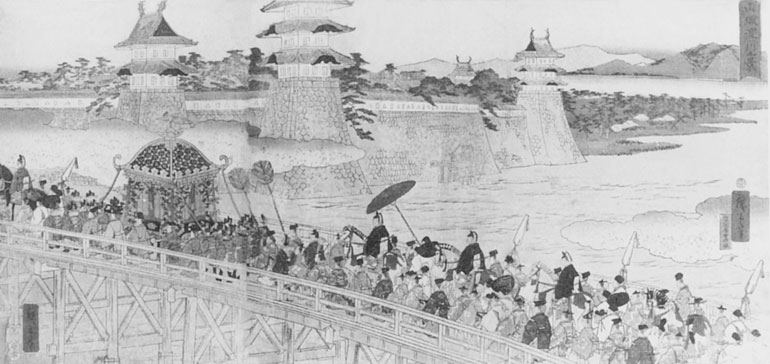 Многолюдие Эдо поддерживалось системой заложничества. Князья вместе со своими семьями были обязаны являться в Эдо и жить там. Только по прошествии года им разрешалось вернуться в родное княжество. Тоже на год. Семья же оставалась жить в Эдо. На узких дорогах, ведущих в Эдо, часто можно было наблюдать многокилометровые княжеские процессии. Сам князь мог путешествовать и верхами, и в паланкине. Свита и охрана передвигались по преимуществу пешком. Заставляя князей жить на два дома, сёгунат намеренно истощал их финансы. Держа их неподалеку от себя под надзором многочисленных агентов, сёгун предотвращал возможность сговора. Расписание княжеских путешествий было составлено таким образом, чтобы они не могли повстречаться на одной дороге.