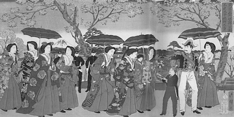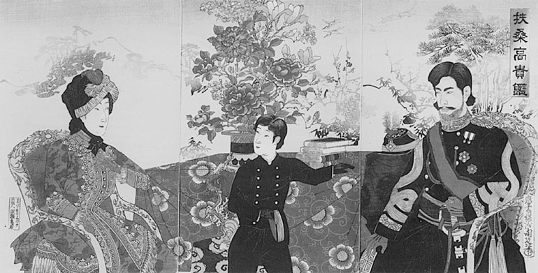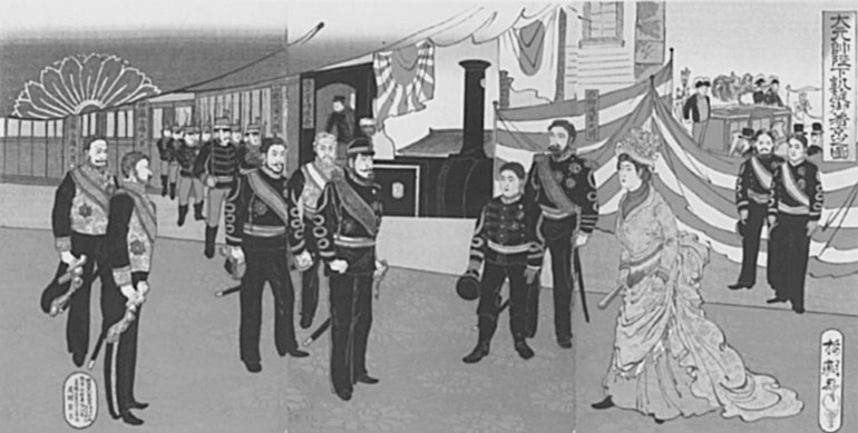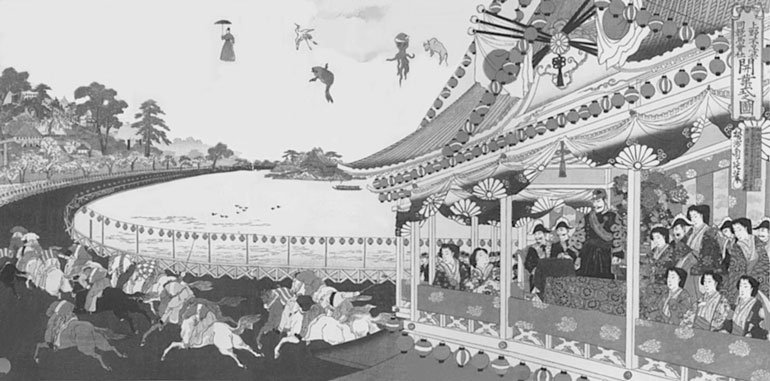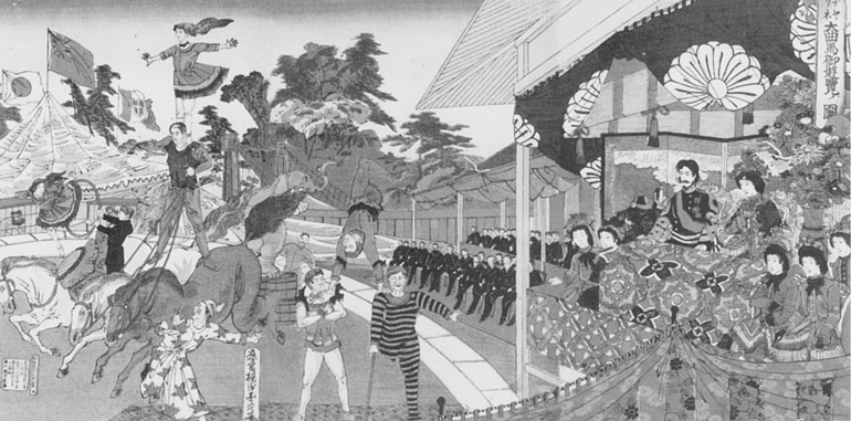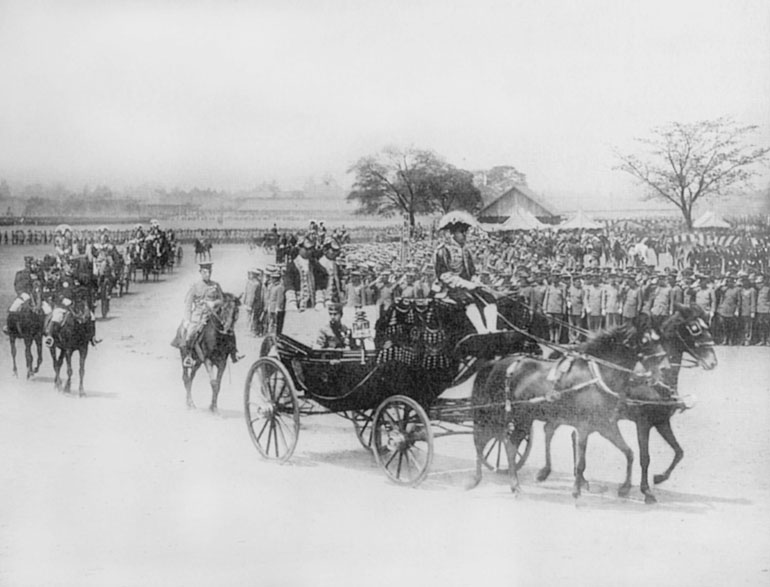 Мэйдзи родился еще «в эпоху тени», но он прожил свою взрослую жизнь «на свету». После того как в 1867 году он занял место своего отца, подданные смогли увидеть его – на улицах и площадях, на военных парадах и маневрах, на вокзалах и выставках достижений японского народного хозяйства, в театре, на ипподроме, в цирке… И он тоже видел своих многочисленных подданных. Он был первым из японских императоров, кто смог воочию убедиться, что они действительно существуют.