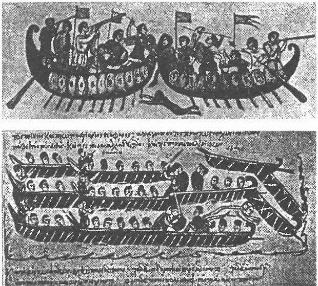 (обратно)Вид, устройство и грузоподъемность древнерусских морских ладей IX—X вв. изучены недостаточно. Ни письменные источники, ни археологические материалы не позволяют сделать подробное их описание. Две полностью сохранившиеся славянские лодки-однодеревки (8,33 и 9,8 м длиной), вытянутой обтекаемой формы, быстроходные и маневренные, были обнаружены в Микульчице (Чехия) (см.: Сорокин П.Е. О некоторых тактических приемах борьбы на воде в Древней Руси // Раннесредневековые древности Северной Руси и ее соседей. СПб., 1999. С. 211). Но это, очевидно, речные суда. В «Тактике» Льва VI Мудрого (890-е гг.) говорится, что «северные скифы» используют «более быстроходные, легкие и меньшие по размерам» суда, чем арабы, «потому что, спускаясь к Черному морю по течению рек, они не могут использовать более крупные суда». Г.В. Вернадский предположил, что древнерусская морская ладья была схожа по типу с казацкой морской чайкой. Для этого судна ствол дерева служил лишь основанием, на котором из тяжелых дубовых досок воздвигалась сама лодка — борта, нос, корма и т. д. Длина сорокавесельной чайки достигала двадцати метров, высота мачты — почти семи метров (см.: Вернадский Г.В. Киевская Русь. С. 38—39).