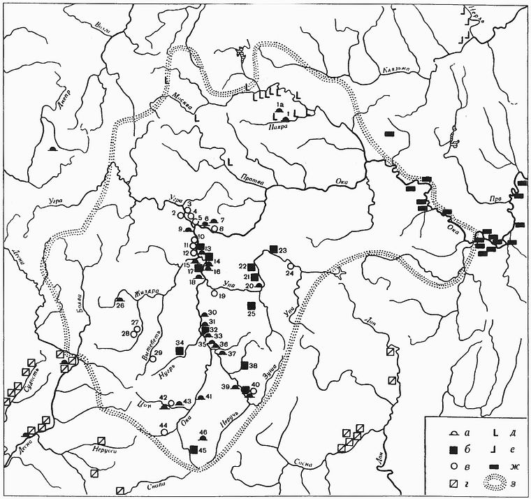 а — курганы с трупосожжениями; б — курганы с трупоположениями; в — курганы со «специфическими» древлянскими особенностями; г — курганы дреговичей; д — курганы полян; е — курганы с семилучными височными кольцами; ж — курганы кочевников; з — лесные массивы; и — болота