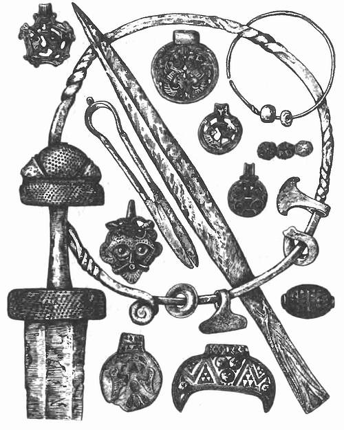 Как бы то ни было, но моравский этнокультурный элемент сильно ощутим в археологии Киева этого времени. Исследователи выделяют в особую группу украшения IX—X вв. из Среднего Поднепровья, орнаментированные растительными и фигурными мотивами, вроде серебряных оковок турьих рогов из Черной могилы в Чернигове и оковки рукояти меча из дружинной могилы близ Золотых ворот в Киеве, отмечая, что «такую технику и орнаментальные мотивы можно прослеживать и на некоторых поясных бляхах и наконечниках из Микульчиц, Бржецлава-Поганска, Старого Места, Желенок, и особенно на типичных великоморавских украшениях — гомбиках, находки которых сосредоточиваются в области трех крупных южноморавских центров и далее в Средней Чехии и Юго-Западной Словакии»[31]. Ряд общих элементов объединяет ювелирные изделия Моравии с украшениями из других древнерусских земель, — это видно на примере нитранских и волынских серег, моравских и гнездовских лунниц, моравских и русских эмалей и т. д. Еще более знаменательны параллели в погребальной обрядности. Множество дружинных могил Киева и Чернигова по характеру и деталям захоронений полностью идентичны соответствующим археологическим памятникам на территории Великой Моравии. Особую значимость имеют прямые аналогии в погребениях знати, свидетельствующие об этнокультурном родстве правящей элиты Киева и карпатских русинов[32]. Неподалеку от Чернигова, на правом берегу Десны, даже возник целый моравский город — Моравийск/ Моравск. Другое моравское поселение в Русской земле — Моравица/Муравица — находилось западнее Киева, неподалеку от Луческа/Луцка, при впадении речки Иквы в Стырь.
