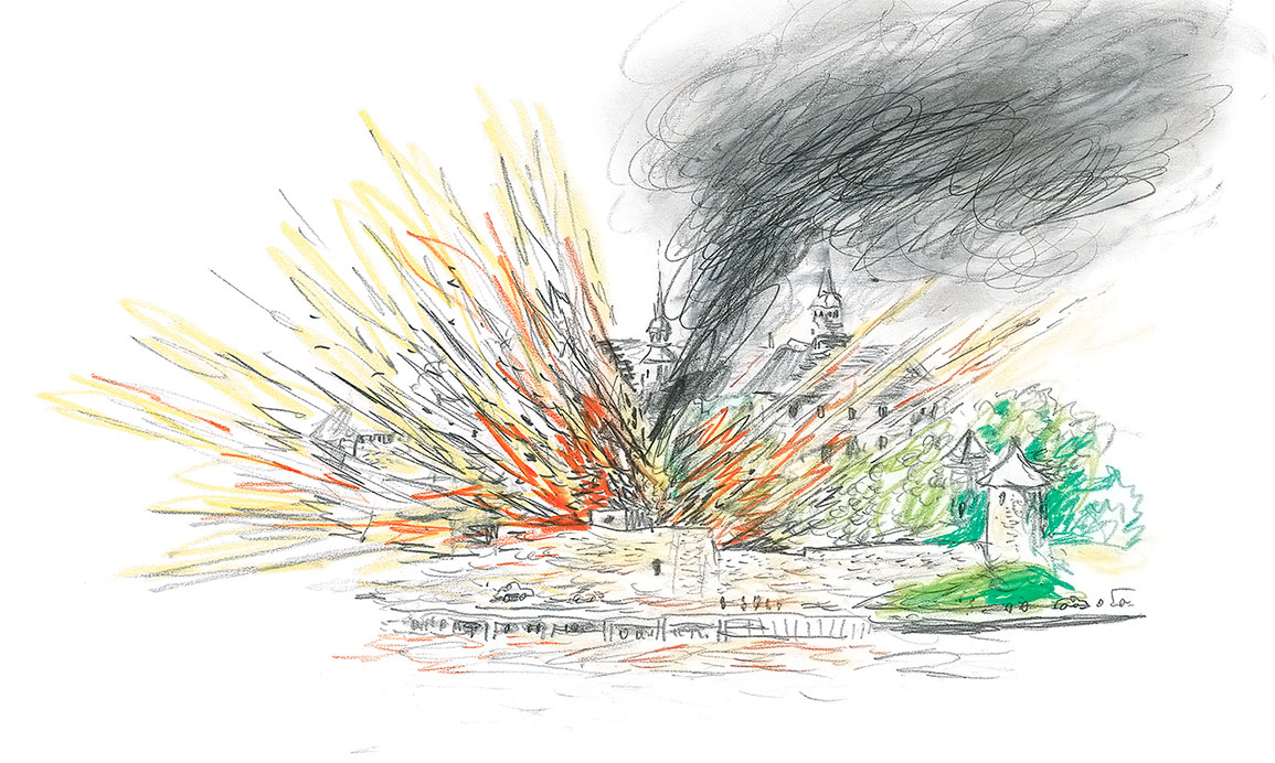 Это было так смешно, что Лисе громко рассмеялась. Семь гвардейцев, стоящих внаклонку задом к крепостной стене и Осло-фьорду в момент, когда начали бить часы на башне ратуши. Но после третьего удара ни Лисе, ни остальные жители Осло и его окрестностей больше не слышали боя часов. Потому что и удары курантов, и смех Лисе заглушил взрыв такой силы, что у людей чуть не лопнули барабанные перепонки, а глаза вдавило внутрь черепа. Следующий взрыв создал воздушную волну, которая прошла от улицы Росенкранц до улицы Карла Юхана, и полотнища всех флагов в городе полностью расправились. Третий взрыв разбил стекла в трех окнах в Не́соддене, а все яблони в Уллевол-Ха́гебю от испуга сразу расцвели. После четвертого выстрела девочка в Сарпсборге, подружка Лисе, посмотрела на небо, где не было ни облачка, и подумала, что сейчас начнется гроза. Пятый взрыв был не особенно сильным, скорее напоминал обыкновенное пуканье, и жители Осло с удивлением переглянулись. Но зато шестой был такой, что паром, который шел в Данию, аж накренился, а стая ласточек, летевших из Африки в Норвегию, сразу передумала и повернула обратно. Отзвуки дошли до площади Курфюрстендамм в Берлине, струя фонтана вдруг наклонилась и облила водой всех туристов, отчего дети радостно захохотали.