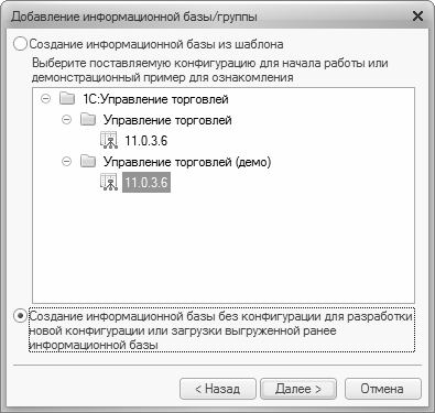 Если необходимо создать информационную базу на основе имеющегося шаблона (например, на основе демонстрационной конфигурации), нужно установить переключатель в положение Создание информационной базы из шаблона. При этом ниже отобразится перечень имеющихся конфигураций и шаблонов, в котором надо выделить требуемую позицию щелчком мыши и нажать кнопку Далее.