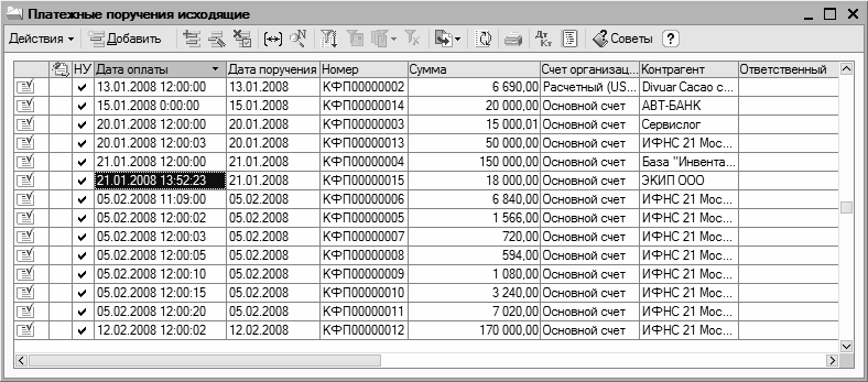 Рис. 1.21. Окно списка документов (исходящие платежные поручения)