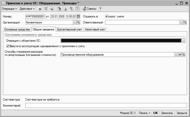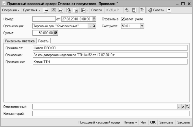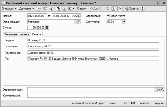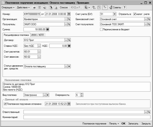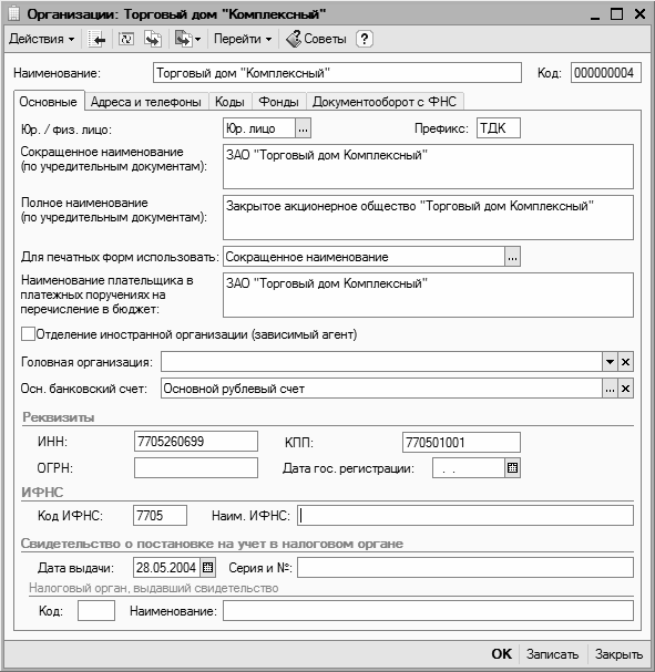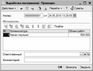 После нажатия кнопки ОК документ будет сохранен и появится в списке документов (см. рис. 12.7), при этом окно документа будет закрыто. При нажатии кнопки Записать документ будет сохранен, но окно останется открытым.