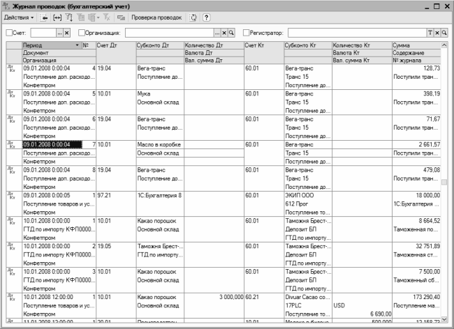 Чтобы просмотреть результат проведения документа по учету, выполните в окне редактирования команду Действия ▶ Результат проведения. В результате откроется журнал бухгалтерских проводок с автоматически примененным фильтром по текущему документу.