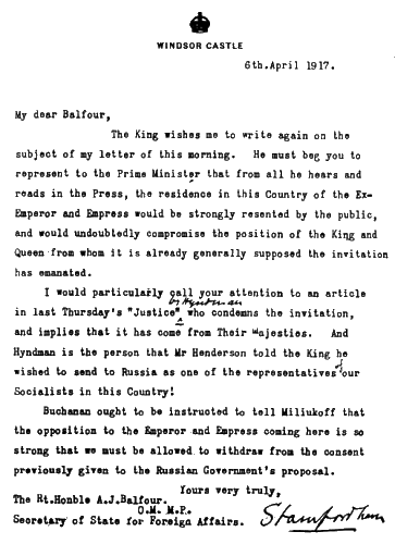 Александра чувствовала себя англичанкой, хотя родилась и выросла в Германии. Это самосознание она усиленно акцентировала, когда в военные годы многие русские уничижительно обзывали ее «немкой». И все же именно Англия отказала ей и ее супругу, — хотя Александра доводилась королю Георгу V двоюродной сестрой, а Николай двоюродным братом, — после отречения и ареста в политическом убежище, когда такая возможность еще не исключалась Временным правительством. В конце августа 1918 г., более чем через месяц после убийства царской семьи, когда за границу просочились слухи о том, что смерть постигла не только царя, король Георг запишет в дневнике, вынося задним числом свой приговор Александре: